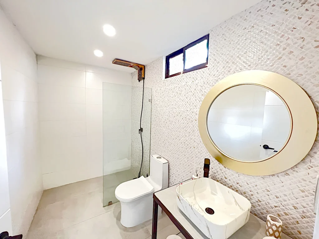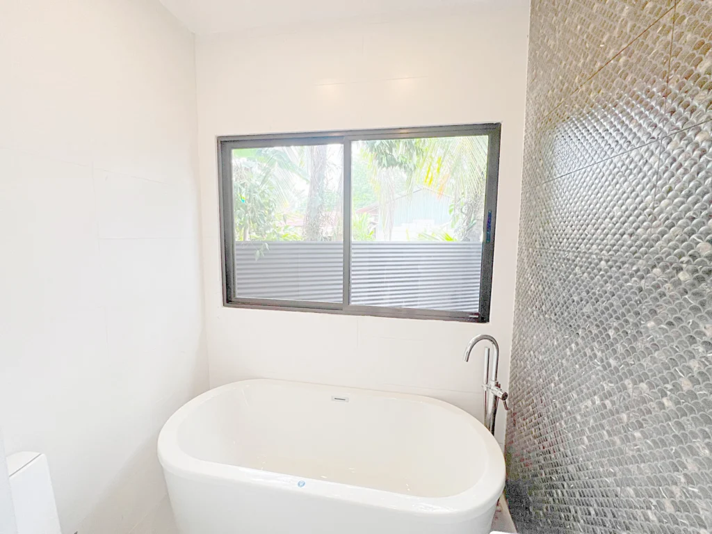 Bathrooms: 3 elegant bathrooms finished with designer tiles — one en-suite with soaking tub, one near the bedrooms, and one next to the pool area.