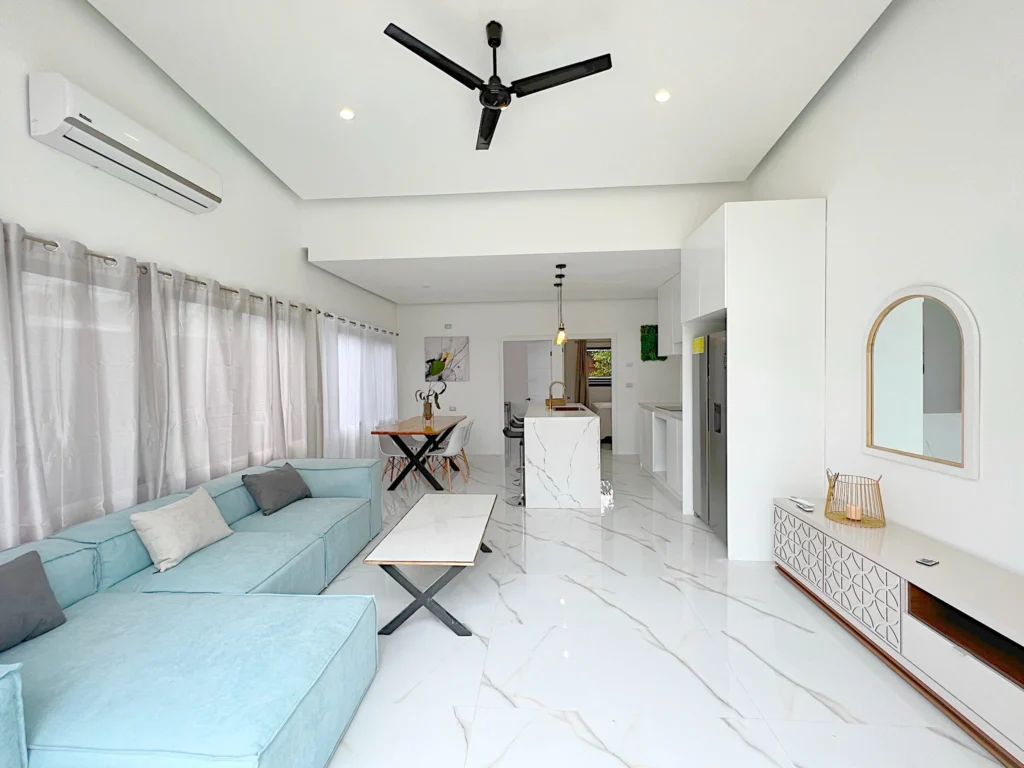 Architectural Design: Open-concept living room with 4-meter-high ceilings and large sliding glass doors opening directly to the pool deck.